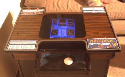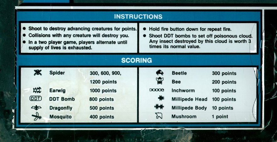 The following images show the artwork I used to restore my Millipede cocktail glass. The artwork on mine was very trashed as you can see by the following pictures. The second image is what I wanted the final cocktail table top to look like when finished, and shows the placement of the individual scans. It is not to scale and is only included for reference. The instruction card is located on each Player's left side, the logo is located on Player Two's right and the start image with the red triangles is located above the start buttons on Player One's right.